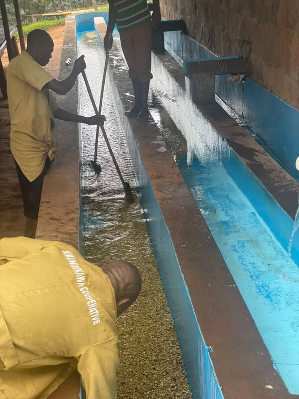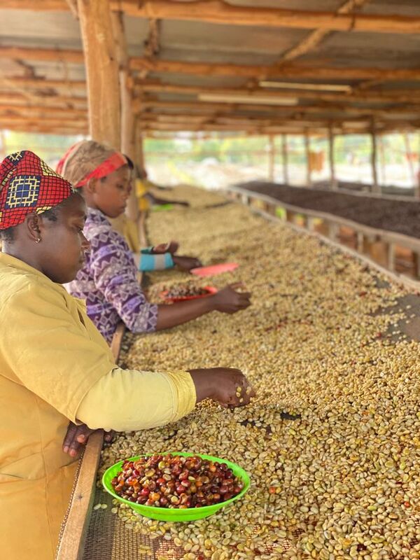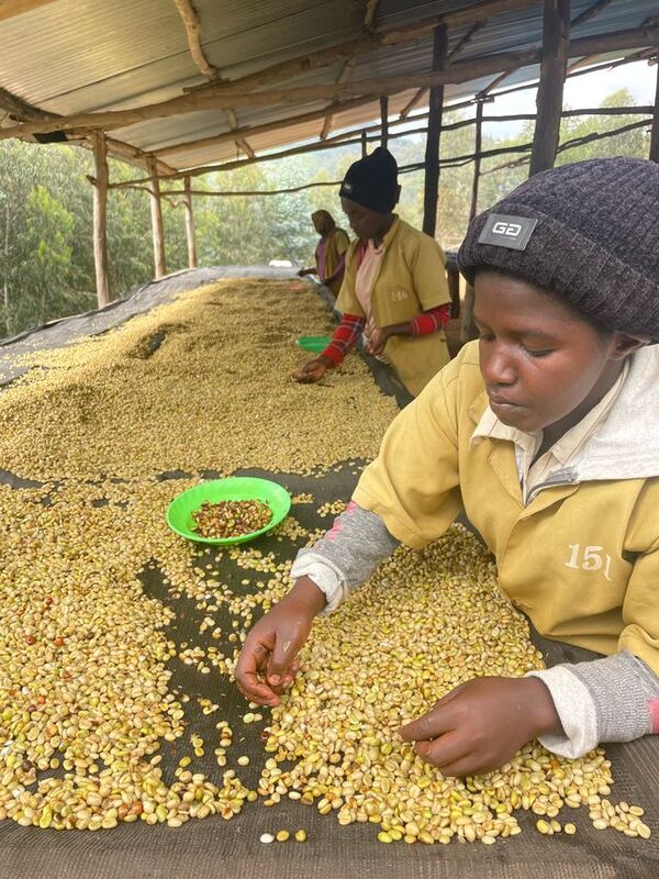 As at most washing stations in Rwanda, women do the majority of the hand sorting. This takes place in two stages – on the covered pre-drying tables and on the drying tables. Washed beans are moved from the wet fermentation tanks onto the pre-drying tables, where they are intensively sorted under shade for around six hours. The idea is that greens (unripes) are still visible when the beans are damp, while the roofs over the tables protect the beans from the direct sunlight. Next, the beans are moved onto the washing station’s extensive drying tables for around 14 days (depending on the weather), where they are sorted again for defects, turned regularly, and protected from rain and the midday sun by covers, ensuring both even drying and the removal of any damaged or ‘funny looking’ beans. After reaching 11% humidity, the coffee is then stored in parchment in Nkara’s purpose-built warehouse prior to final dry-milling and hand- sorting at the Cooperative’s brand-new dry mill in Kigali. Each coffee that arrives is also cupped by Musasa’s team of expert cuppers along with the Q-graders of their exporting partner, Rwashocco.